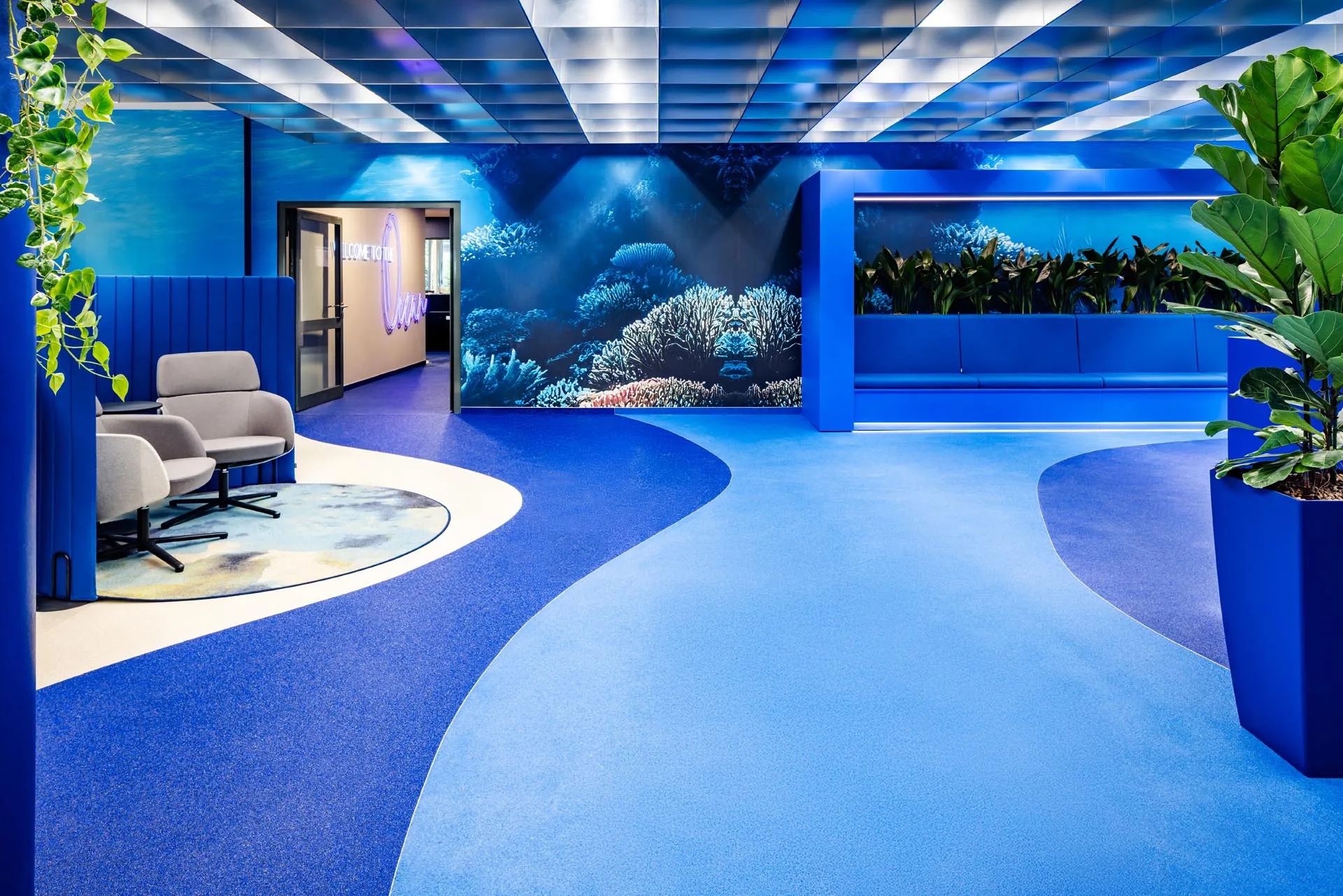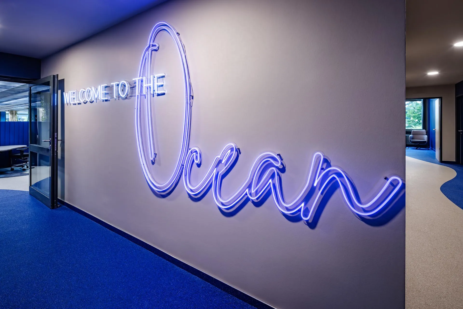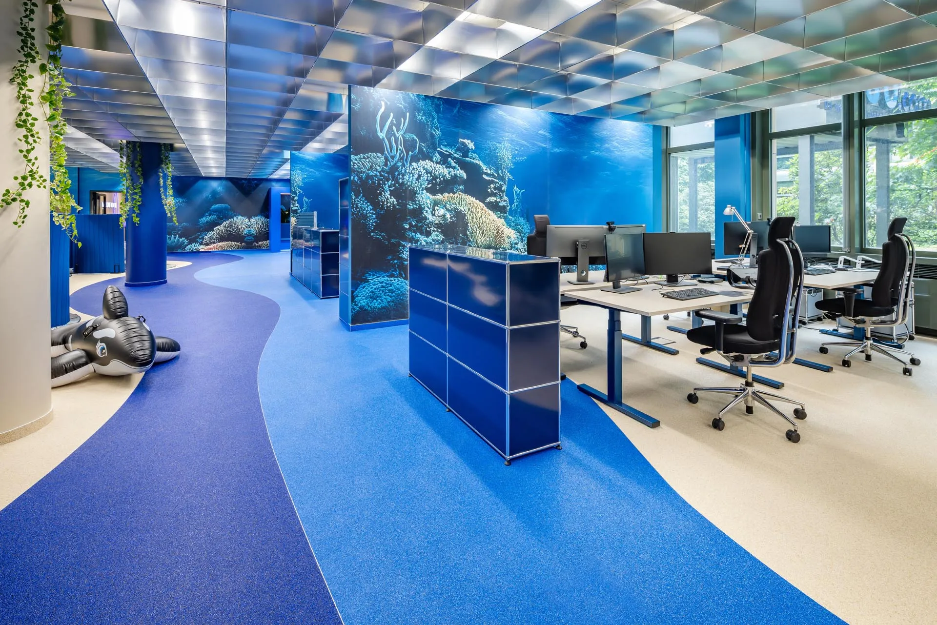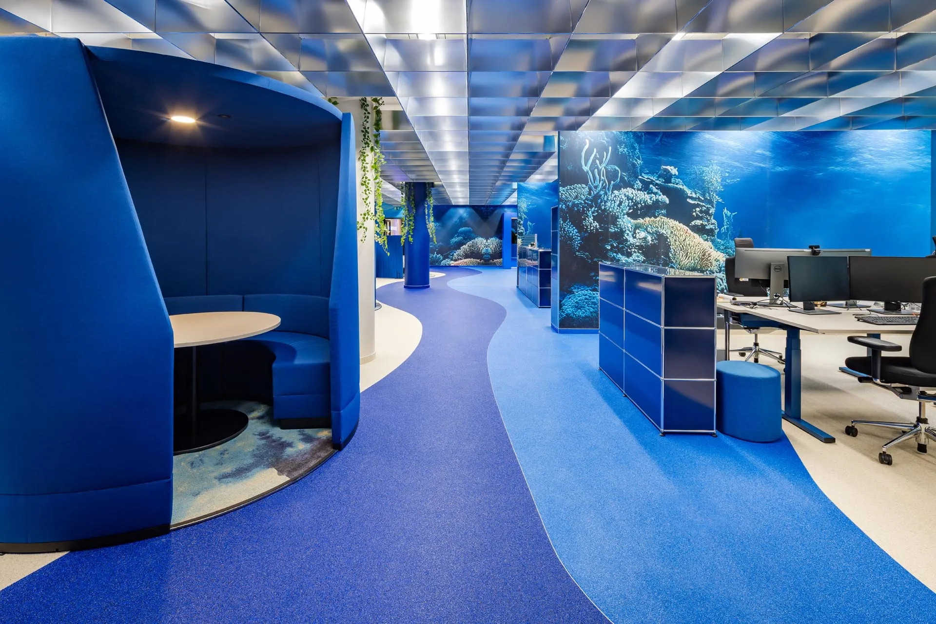 Im Erdgeschoss heißt es „Welcome to the Ocean“. Schon beim Betreten taucht man in eine Unterwasserwelt ein: Wände mit Ozeanmotiven, ein Boden in Meeresoptik und Meetingpoints, die wie kleine Korallenriffe wirken.