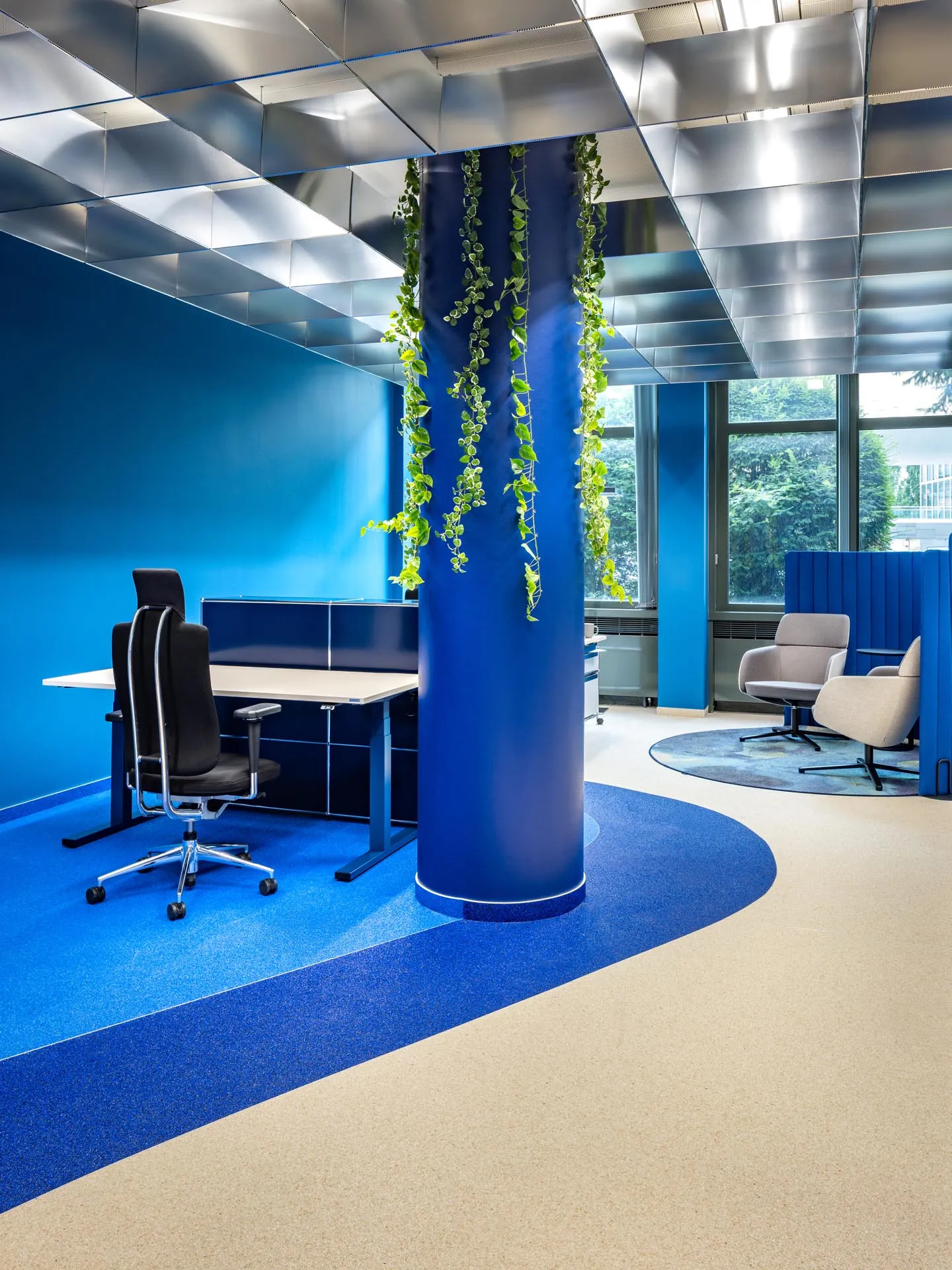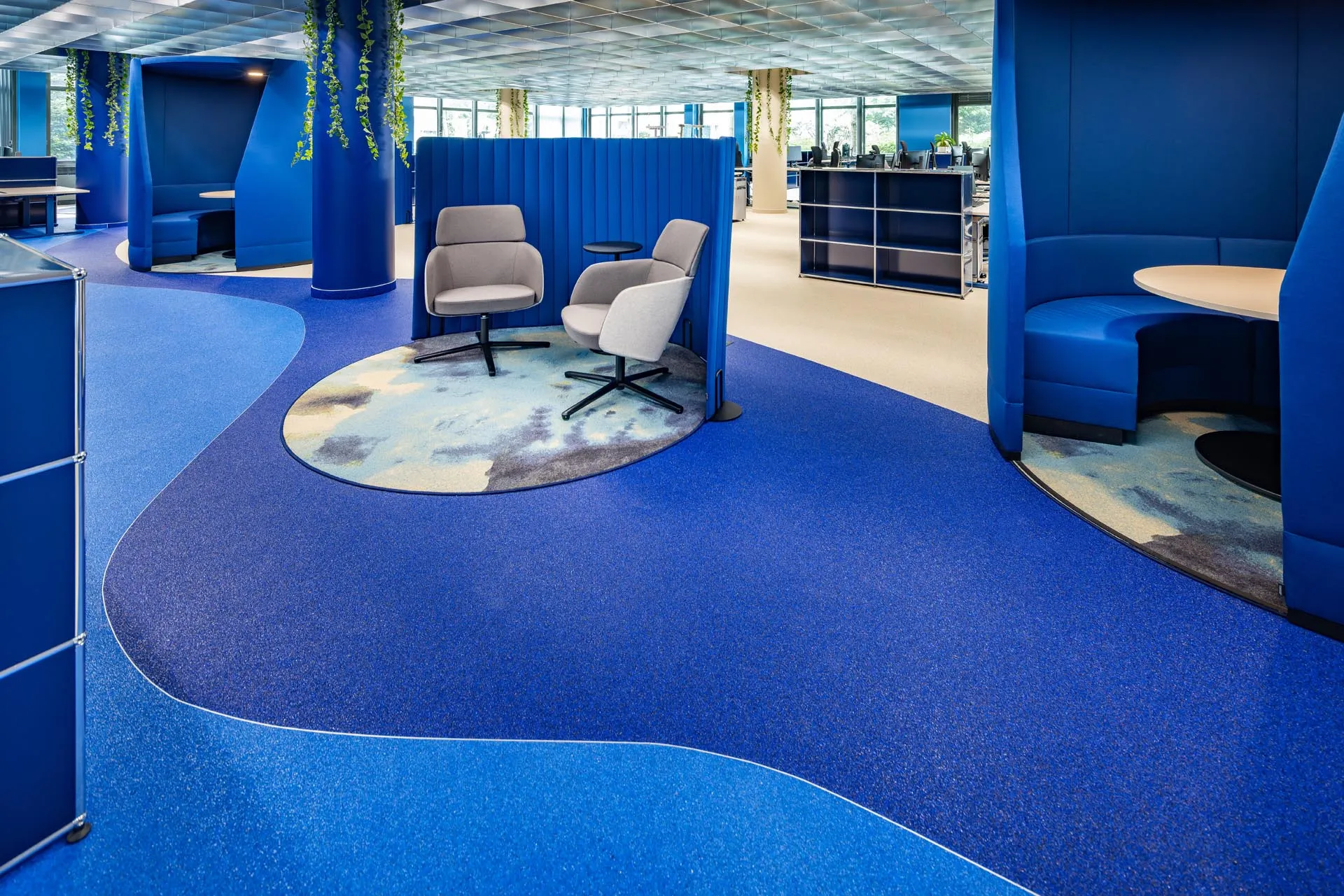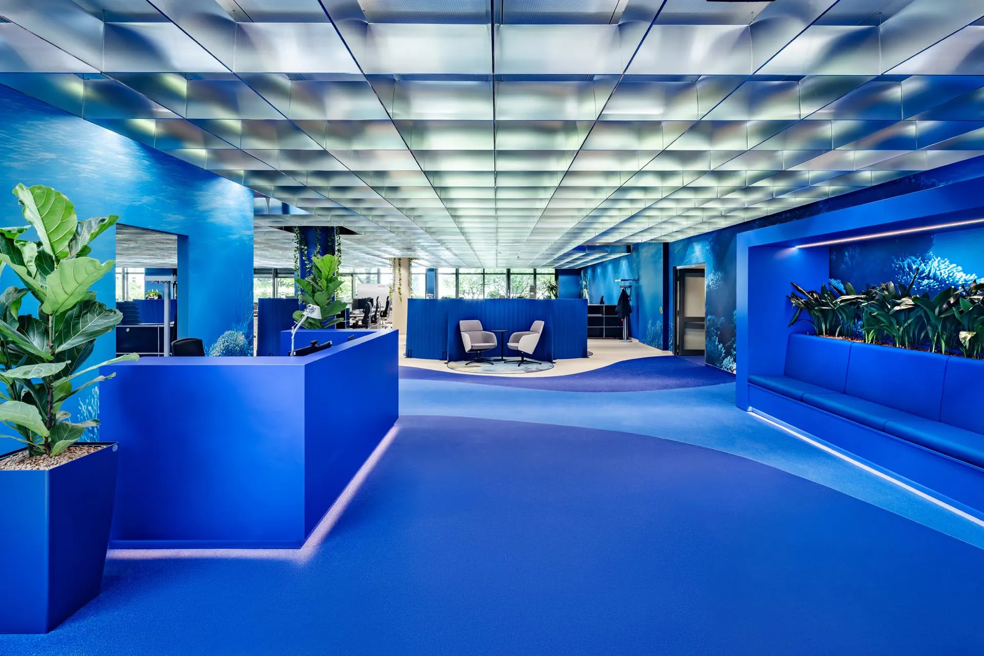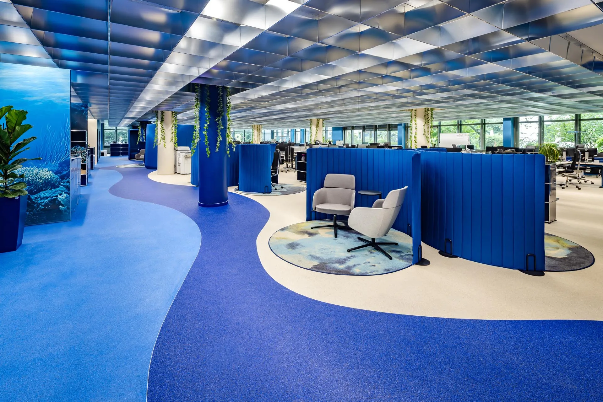Im Erdgeschoss heißt es „Welcome to the Ocean“. Schon beim Betreten taucht man in eine Unterwasserwelt ein: Wände mit Ozeanmotiven, ein Boden in Meeresoptik und Meetingpoints, die wie kleine Korallenriffe wirken.