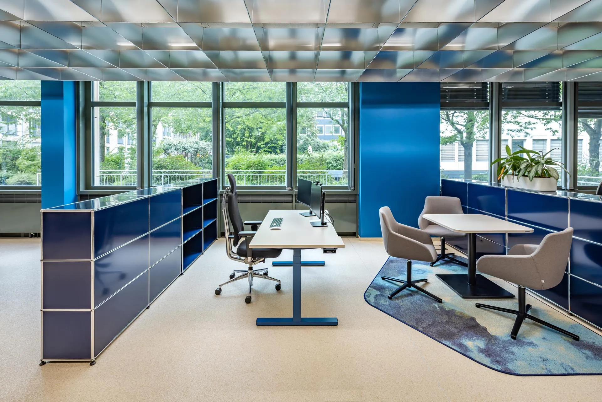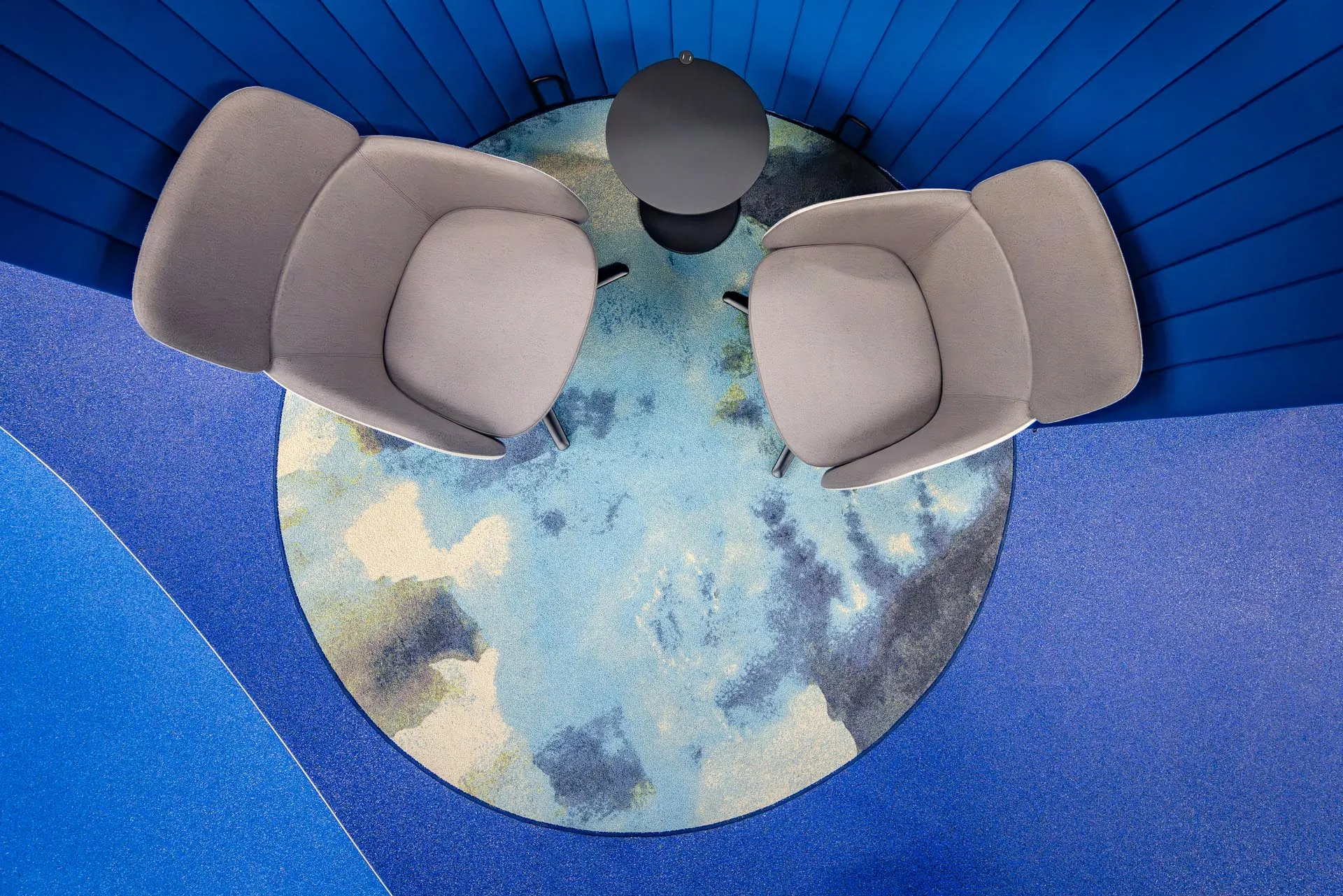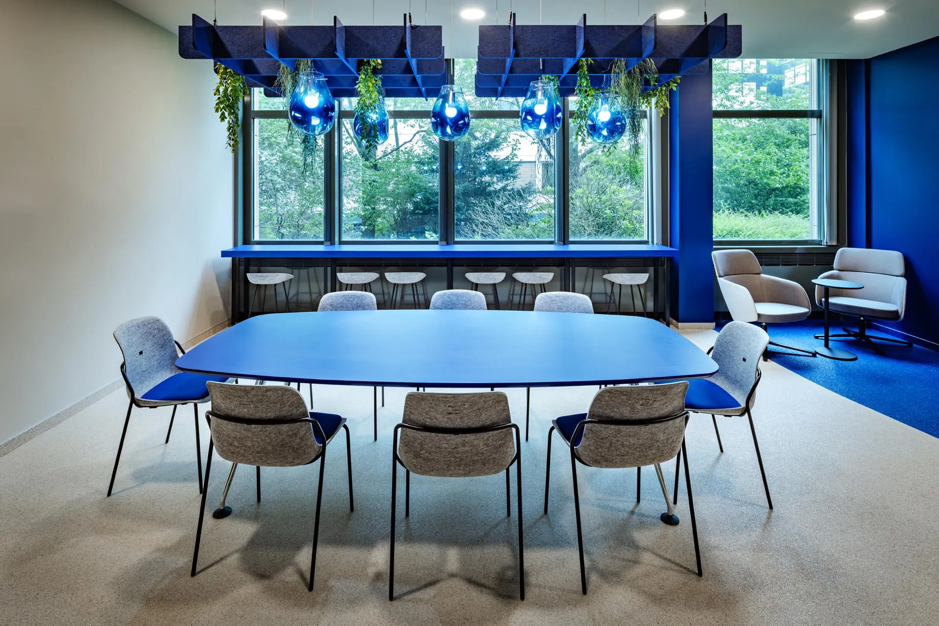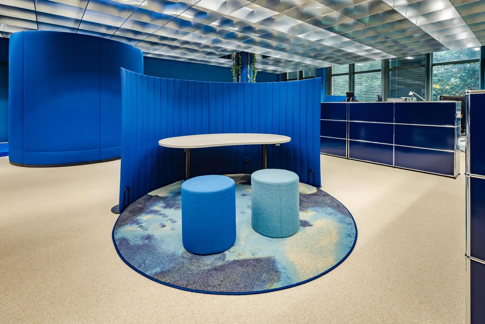 Im Erdgeschoss heißt es „Welcome to the Ocean“. Schon beim Betreten taucht man in eine Unterwasserwelt ein: Wände mit Ozeanmotiven, ein Boden in Meeresoptik und Meetingpoints, die wie kleine Korallenriffe wirken.