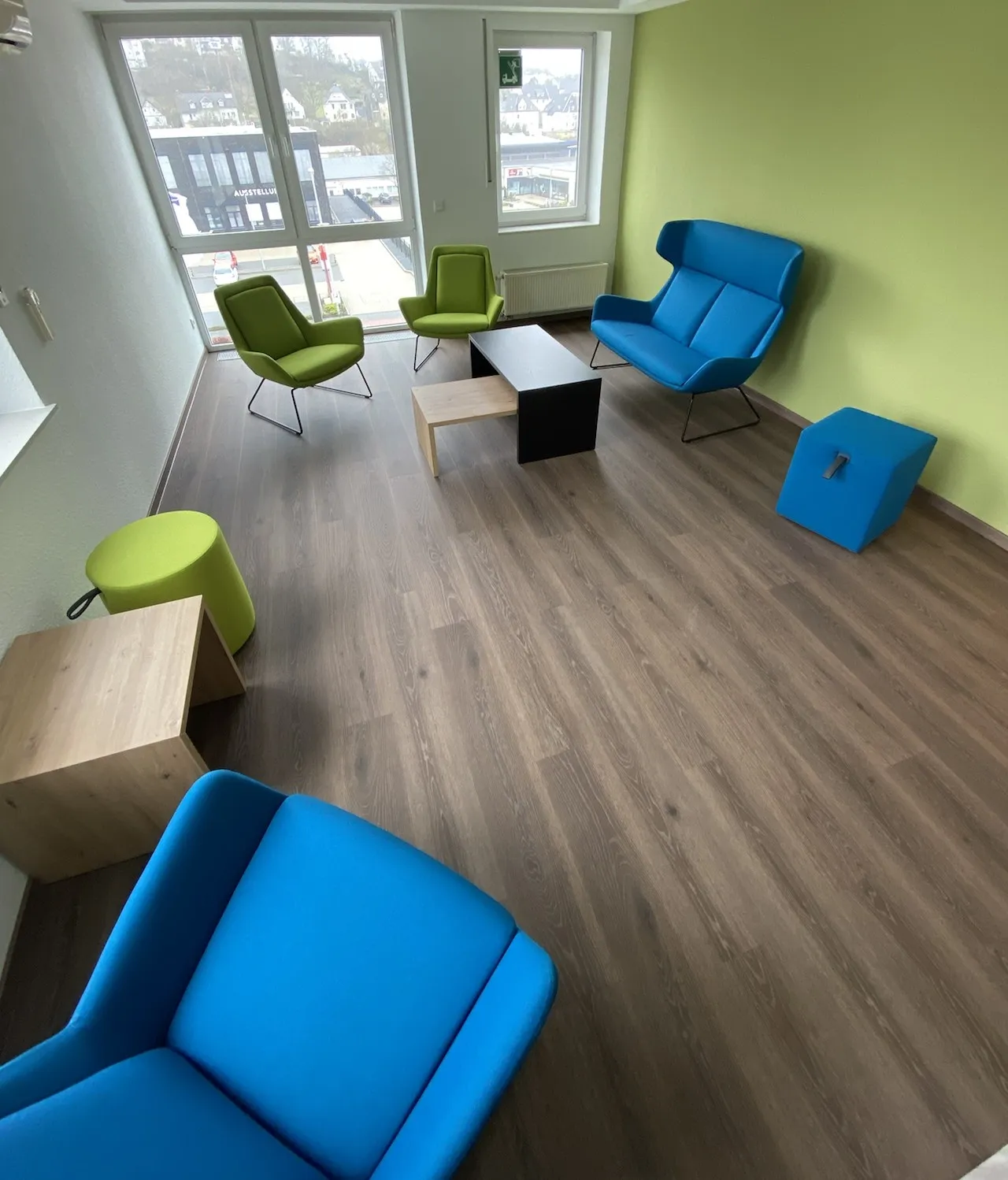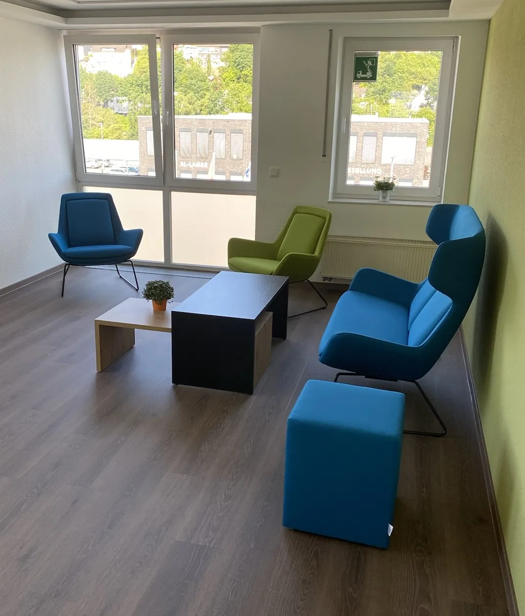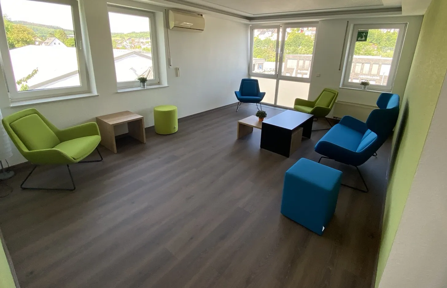 Der Loungebereich lädt ein zum Entspannen, Austauschen und Verweilen. Mit bequemen Sitzmöbeln, warmen Farben und einer offenen, freundlichen Gestaltung bietet er einen idealen Rahmen für persönliche Gespräche, gemeinsames Lesen oder eine kleine Pause zwischendurch.