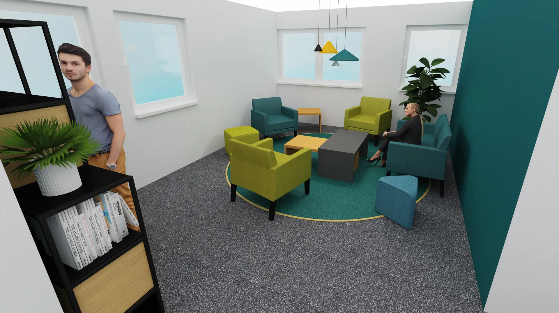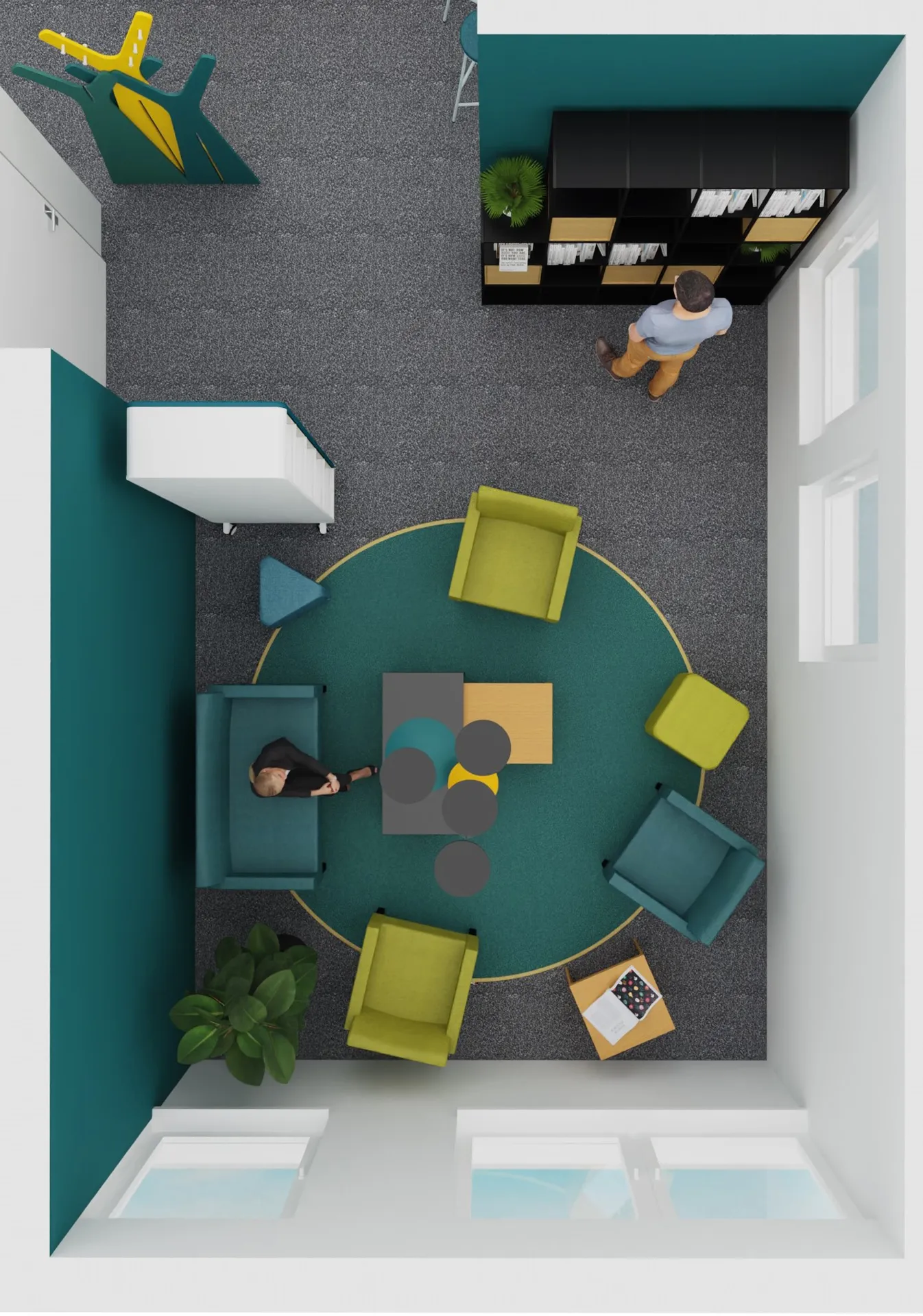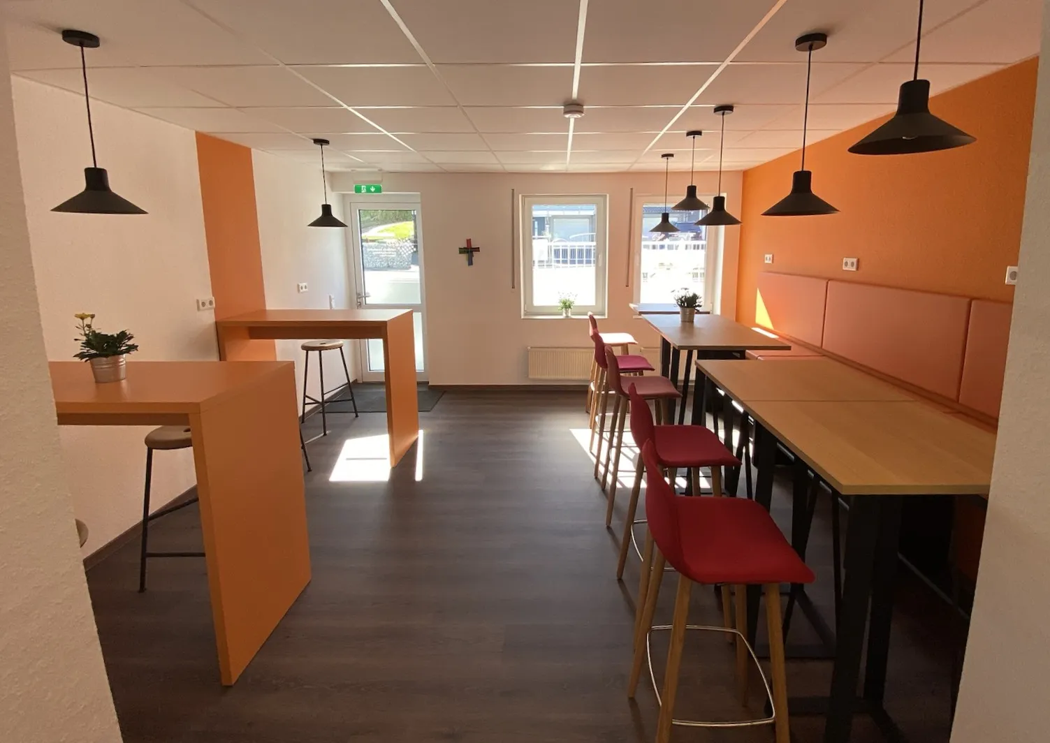 Der Loungebereich lädt ein zum Entspannen, Austauschen und Verweilen. Mit bequemen Sitzmöbeln, warmen Farben und einer offenen, freundlichen Gestaltung bietet er einen idealen Rahmen für persönliche Gespräche, gemeinsames Lesen oder eine kleine Pause zwischendurch.