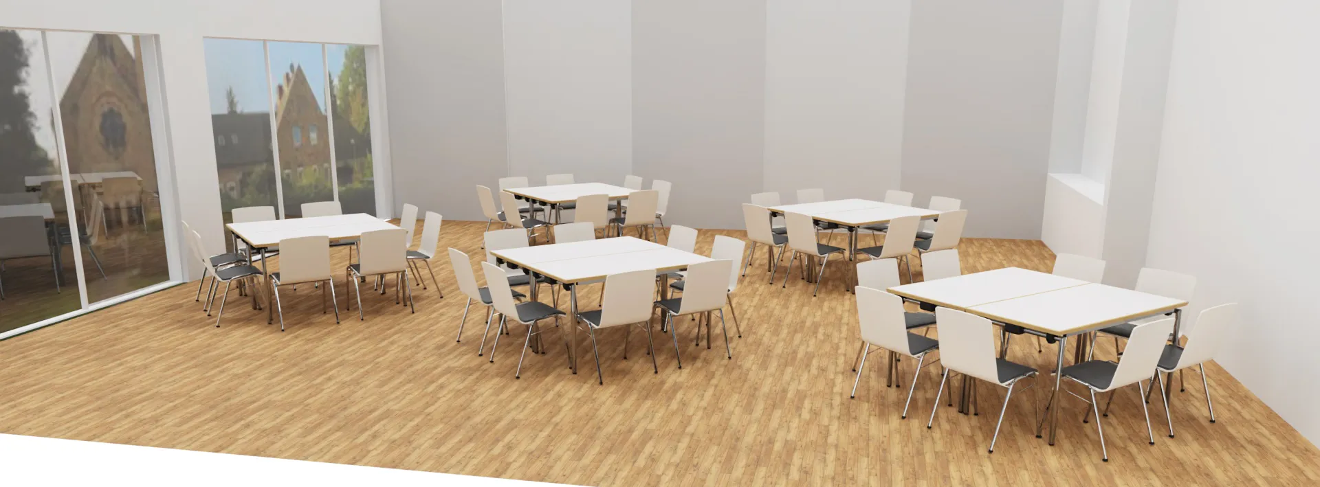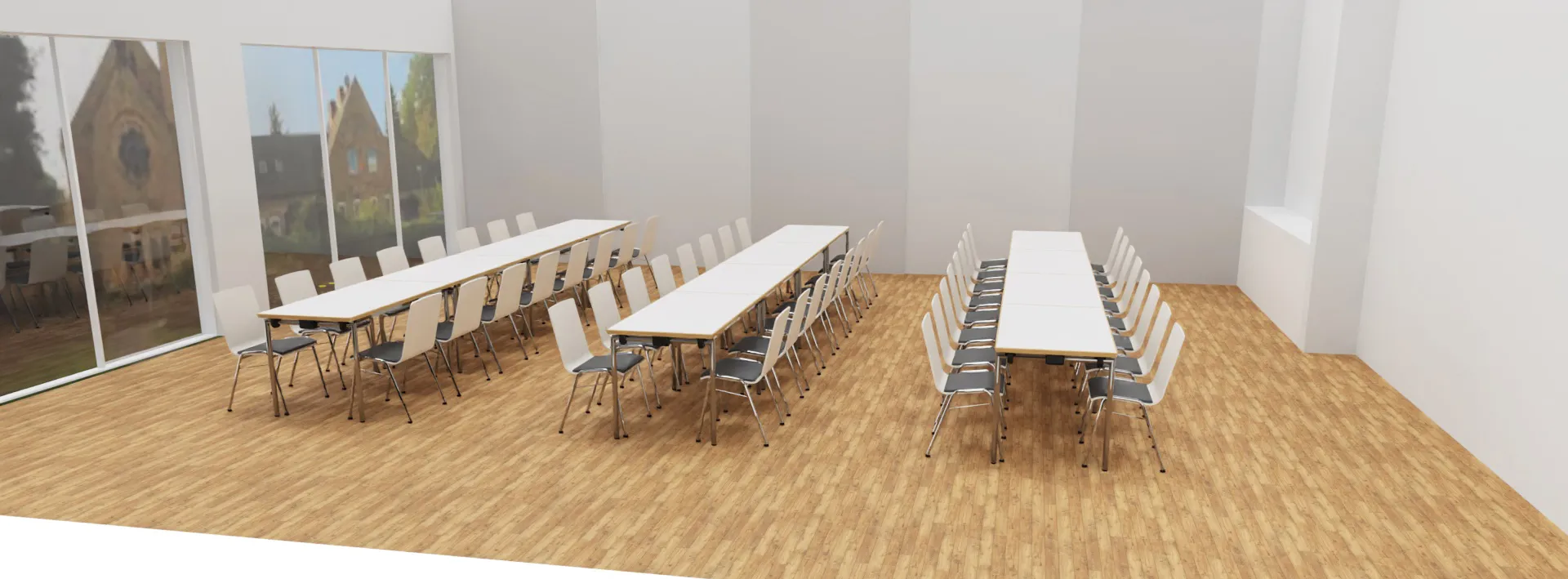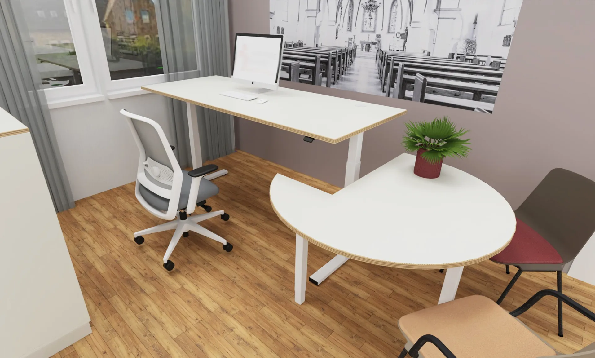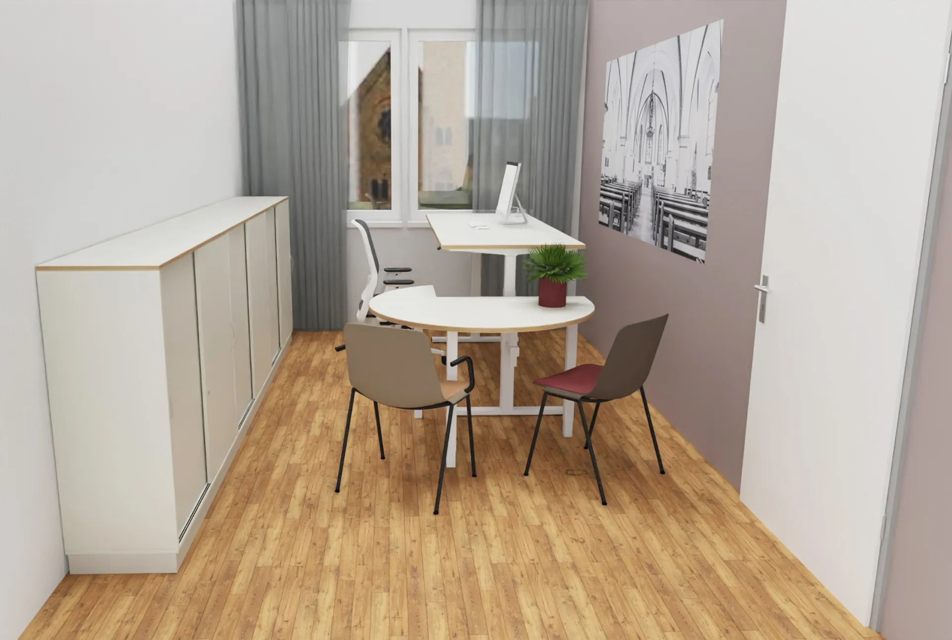 Im historischen Pfarrhaus haben wir moderne Strukturen geschaffen: Ein funktionales Büro für konzentriertes Arbeiten und ein flexibler Multifunktionsraum, der sich für Besprechungen, Workshops oder Gemeindeveranstaltungen nutzen lässt. Tradition trifft hier auf zeitgemäßes Design – für ein Umfeld, das inspiriert und verbindet.